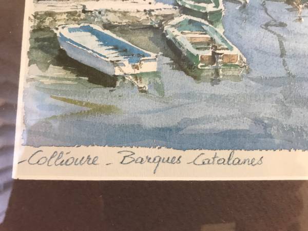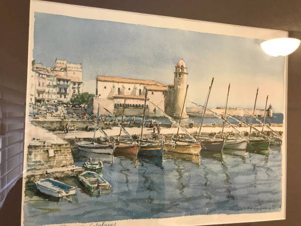 Framed Beach art with sailboats and lighthouse. Measures approximately 23 inches wide by 19 inches tall. Has a very nice wood frame. collioure barque catalane. See picture for artist info. From a...