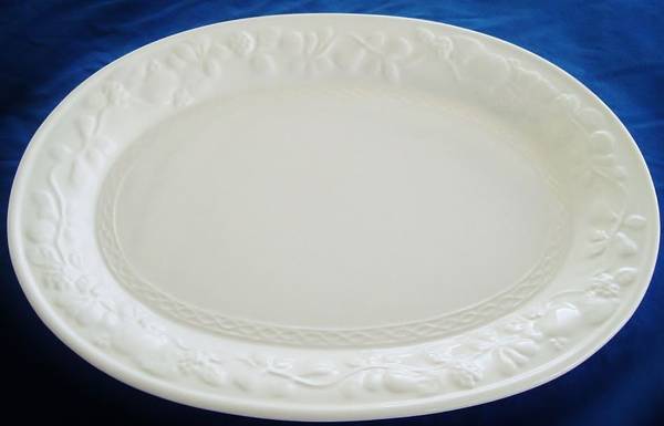 Pic #5) Crofton white ceramic platter. An Aldi brand. 18.5"Lx14"W. Some kind of berries/leaves embossed rim. Looks as new, has some normal pinpoint dots in the finish. Out of production apparently, so if yours broke or you just like Crofton stuff and want a heavy duty serving platter, here you go. Saw a couple on e**y asking $22-$25, yet new it was around $9 I think, based on search results from articles of the time. So fight inflation and greed and get this one for less than the years old price at only...$8