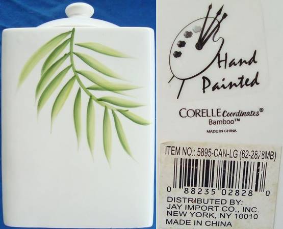Pic 6) Corelle Coordinates Bamboo Leaf canister w/lid. Hand painted, both sides. Canister is 7" tall, 8.5" to top of lid, 5.5" wide, excellent condition...$10