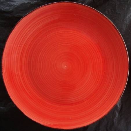 Pic 8) (4) Royal Norfolk red swirl stoneware dinner plates, 10.5". Normal light utensil scratches in the glaze, most are hard to see unless glinted, pretty few for the age. One has a small chip on the back inner rim, doesn't affect how it sits. These in different colors are still at the dollar+ store, so why do people on e**y pay way over that? How about all 4 for...$4