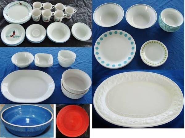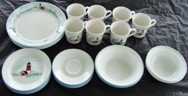 Pic #2) Corelle "Outer Banks" pattern dishes. Lighthouse, cottage and seagulls scene familiar to you North Easterners. Lightly used, 1-2 may have a noticeable scratch in the decal on the salad plates, but most are very clean. I can't fathom the wide ranging sold price logic on e**y (average $3-$5 a piece or so, not including s-hipping), so will make these hopefully cheap enough to sell this decade. Will consider selling groups and maybe singles for slightly higher-than-group price, but prefer to sell the whole group at once.