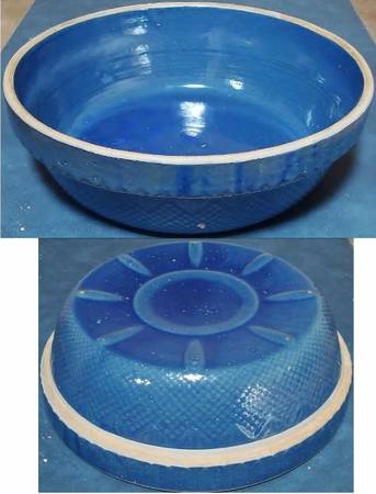 Pic 7) Antique blue bread bowl, clay, embossed design. 9.25" diameter, 3" high. 1 little chip on the side, but overall nice. Seems to be some collectibility to these, but only...$15