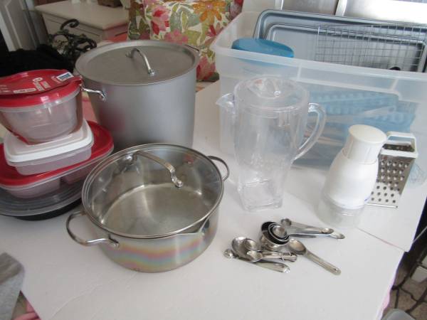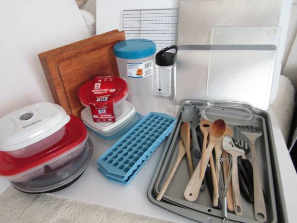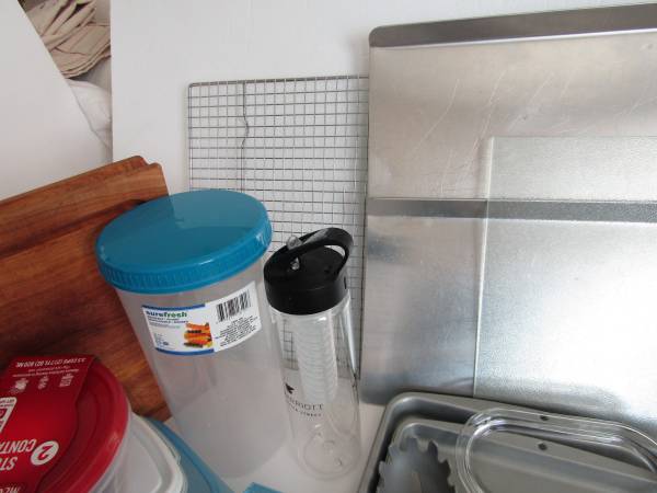 Large lot of misc kitchen items. All in good to very good condition, many new. 4 baking trays, large wire rack, two small wire racks, wood cutting block, storage containers, ice cube trays, assorted...
