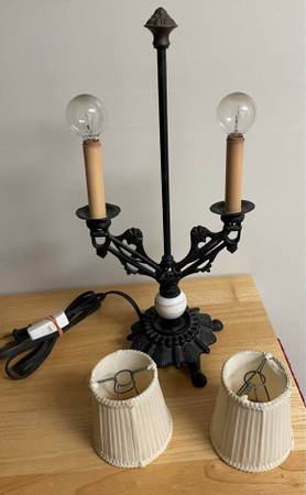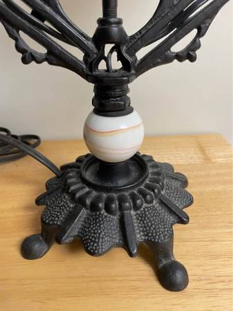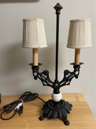 Antique Cast Iron Agate Glass Two Arm Candelabra Lamp with Clip Shades. Switch on cord. Cast Iron and Agate Glass. Measures 19 inches tall and 20 inches wide. Found the same one selling online for...