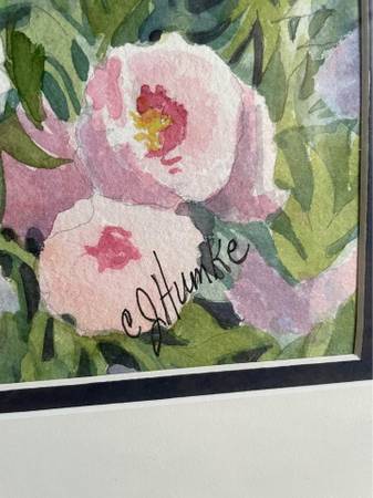 Large Original Signed Watercolor of House with Flowers by CJ Humke. Professionally matted and framed. It measures 27 inches tall and 25 inches wide.