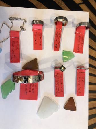 5 Rings: 10K White Gold with (3) 1/8 Carat Diamonds, Shane and Co. Kobalt, Spikes-ti Titanium, Diamond Brand Tungsten Carbide and 1 very old ring with a Light Green Center Stone and 4 Dark Green Stones around the setting.