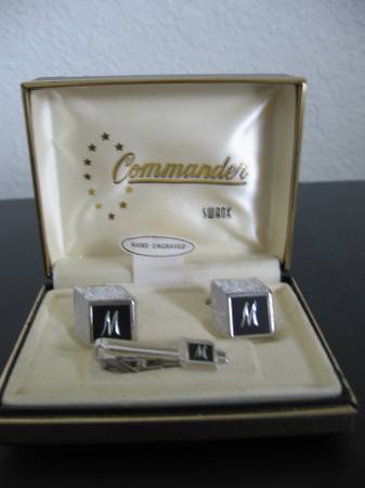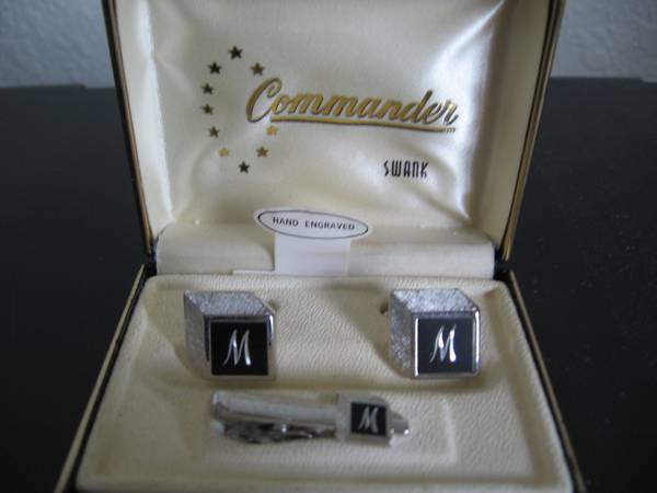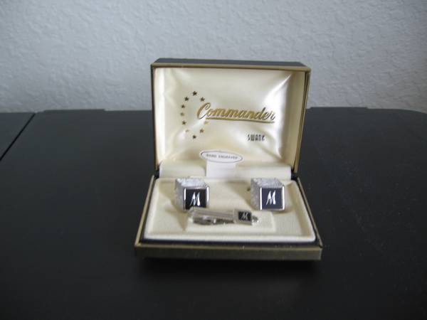 Vintage Swank Commander Cuff Links and Tie Clip great holiday gift Hand engraved with "M" monogram on brushed silver background In original box See photos Please call or e-mail, will not respond to...