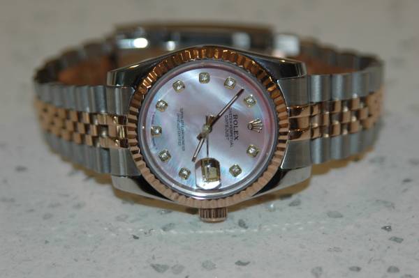 Replica Rlx date just. 36mm pinkish mother of pearl dial with diamond markers. Automatic movement works perfectly. Box and papers available for $60. NO LOWBALLERS, NO PHONE CALLS, NO EMAIL, TEXT ONLY nine four one, 2238630.