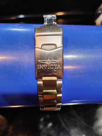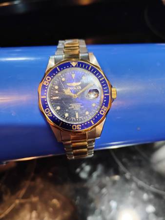 Invicta Pro Diver Watch features aprecise Quartz movement as well as a stainless steel case. Its blue, metal dial is enclosed by a highly protective Mineral Crystal. This watch is finished by a strong steel, gold, stainless steel band, and it offers 200 m water resistance. In excellent condition needs battery see picture for better description.
