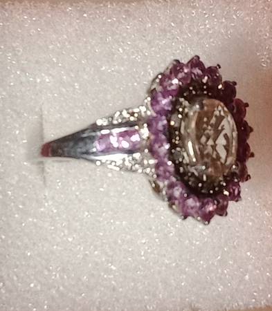 Morganite with Pink Sapphire and Diamonds Halo Accents. It is a size 9.25 The oval morganite measures about 8mm by 6mm and weighs about 1.1 cts. The total weight of the natural pink sapphires surrounding the center stone is about 2 cts. The total natural diamond weight is .03 cts. The diamonds are I2 to I3 in clarity. The ring weighs 4.2 grams and is hallmarked 925 inside the ring.