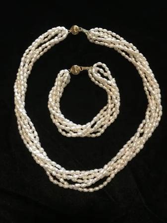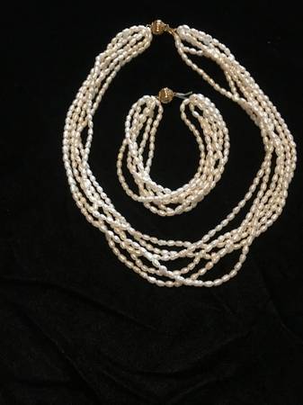 New- Exquisite- 18” 6-Strand Fresh Water Rice Pearl Necklace & Matching 8” Bracelet: Purchased in Kauai.N never worn. Beautiful twisted 6-strand necklace with spherical gold tone clasp. Matching 6-strand bracelet. Perfect gift.- Wear twisted or non-twisted. Also have a 10-strand fresh water pearl necklace and matching bracelet listed. Originally paid $150, priced at $80. Please do not set up an appointment to arrive and offer less