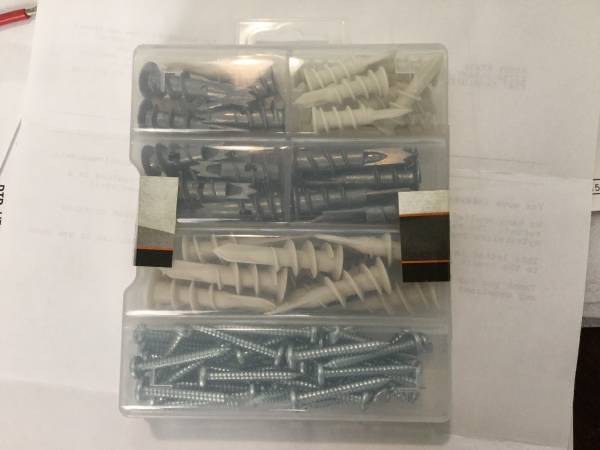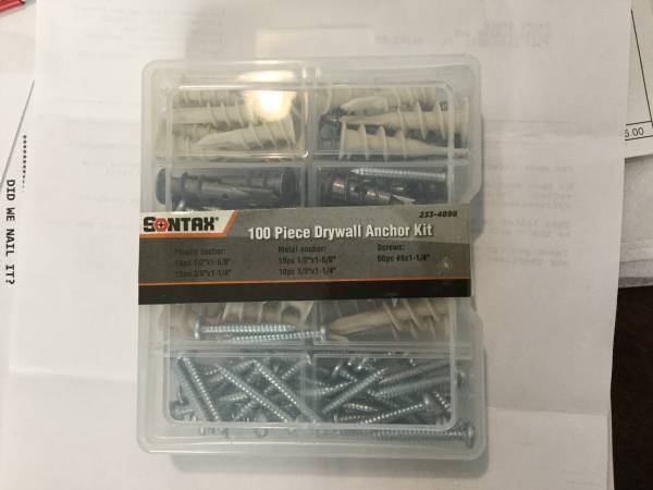 100 piece drywall anchor kits. Includes various sizes of plastic anchors and metal anchors along with screws. New in the package. Asking $3 per package, two available Great for hanging pictures,...
