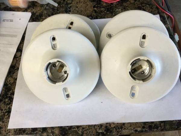 5 White molded plastic(?) lamp/light bulb holders. 4-7/8” diameter. No longer need. Asking $1.50 ea 1 White porcelain lamp holder with pull chain. 4-1/2” dia. Asking $1.50 1 White porcelain lamp...