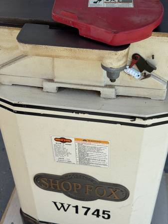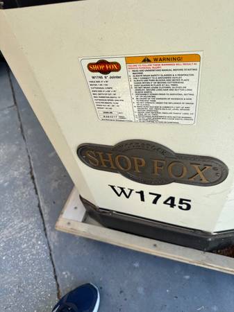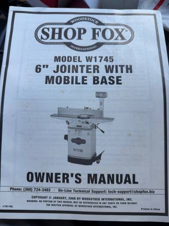 Heavy-duty Shop Fox Model W1745 6-inch jointer with built-in mobile base. Excellent for precision edge-jointing and flattening boards. Solid cast-iron tables, adjustable fence, and powerful motor. Well-maintained, smooth-running machine with original manual included.
