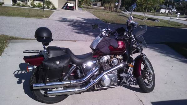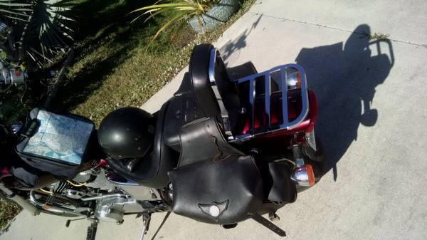 Extras : full cover, windshield, tachometer , leather side saddle bags and front pouch, tank mounted storage bag, rear luggage rack, heavy duty cable lock, 3 helmuts.