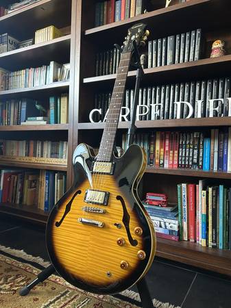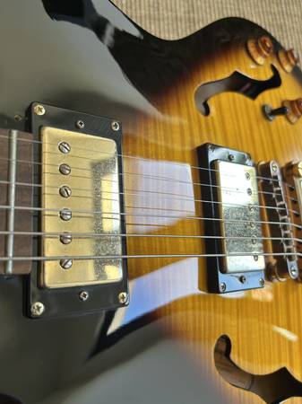 Gibson confirmed this is a Korean Dot Deluxe VS and was a Guitar Center exclusive, with the only "Custom Shop" upgrade probably being the beautiful flame top. Mechanically it is in great condition with just some minor cosmetic blemishes. The fretboard has some spots in the wood (see pics) and there is some metal patina. It is missing the pickguard. No case or bag. Weight 8.25 lbs.