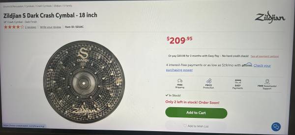Awesome cymbal- great articulation and power. Unique sound that adds to the mix and cuts through the band. Only selling because I have to. Check out the price of this cymbal new.