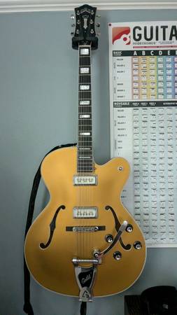 Nearly new Guild X175 Special. The Dyna sonic pickups are clear punchy and have that old school vibe. The Guildsby tremelo has had the pins removed and has been cross drilled making it a string through design. This drastically improved tuning stability and it keeps tuning very very good. I bought the Guild new in May 2025 and had Sweetwater set it up for 11-50 Chrome flatwounds. I also had the guitar pleked for an additional $300.00. it plays like butter and has a very familiar 9.5 radius fretboard. It's a great guitar but not a keeper for me and I have my sights set on another so need to pass it on to the next lucky owner.