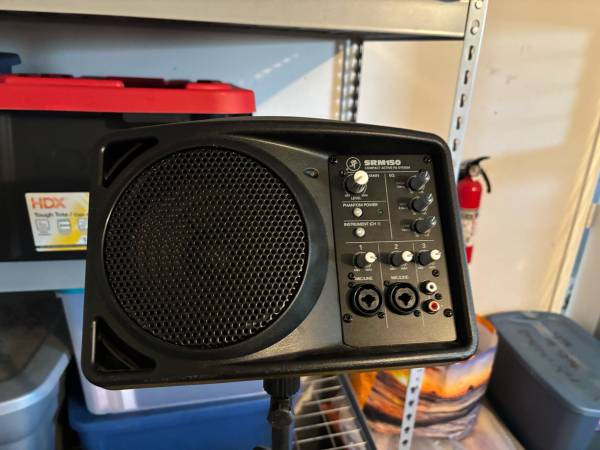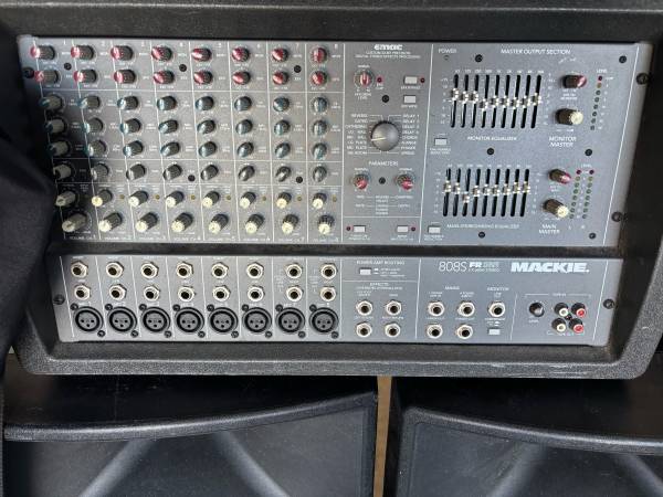 A Mackie 808 stereo so 808S amplifier to Mackie sump 15 front and speakers a Mackie powered monitor two shirts all the cords you’ll possibly need for guitars for amplifiers for the speakers also lighting. There’s LED lighting with adaptable cord. Everything a young band would need to get started.