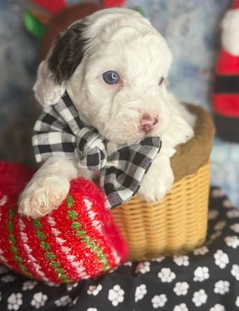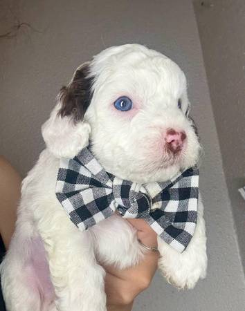 Male parti (white/chocolate) maltipoo puppy Blue eyes 9 weeks old Up to date on shots Potty Pad trained Crate trained Friendly, playful and sweet