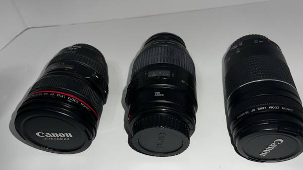 Canon Rebel XS EOS 1000D body and four lenses; Canon EFS 18-55mm 0.25m/0.8ft, Canon Zoom Lens EF 75-300mm 1:4-5.6, Canon Zoom Lens EF 24-105mm 1:4 L IS USM, Canon Macro Lens EF 100mm 1:2.8 USM. with remote, Tiffen Filters, battery and charger, backpack. All in excellent condition, barely used.