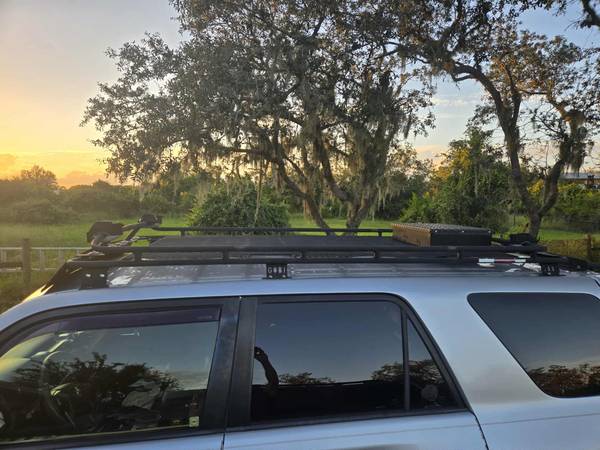 Gobi rack for Gen5 4Runner. Includes rack, wind deflector, cross bars, large tool box ($300 add-on new), Yakima canoe supports ($200 new) and rear ladder. Rack has very minimal light surface rust. Top of ladder has a real patch of rust. Price is firm and cash only. Can be seen in Myakka City after work/weekends, or Sarasota (Fruitville) during work hours