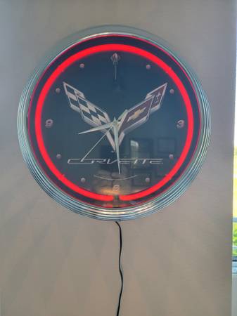Corvette collection: Jacket, electric neon wall clock, 50th anniversary wall temperature indicator, (1) metal sign, (1) plastic sign, dozens of premium-quality frameable posters, 1 of the dozens of posters included is already framed, (7) books, package of 4 tumblers, 4 light switch covers, (4) Corvette "Carbon" labled wheel inserts, and 2 Stingray hats.