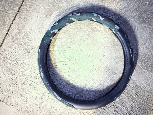**NEW** Steering Wheel Cover black with 3 sections of green camouflage areas. This is NEW - Never Used. Please: TEXT ONLY; I cannot answer phone calls