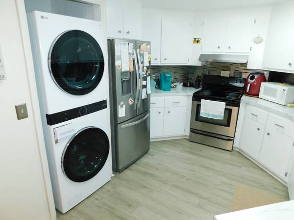 KITCHEN/LAUNDRY ROOM: Whirlpool refrigerator, Frigidaire range, LG dishwasher, GE microwave, one piece LG washer and dryer set