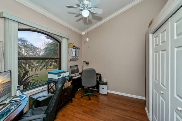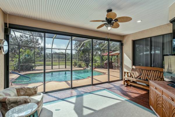 This elegant 4-bedroom, 3-bath residence is situated on nearly 1 acre of land with tranquil water views and features a corner lot location. The main house includes three spacious bedrooms, two full bathrooms, split-level living, a separate dining room, living room, bonus room, office/den, enclosed Florida room, and an eat-in gourmet kitchen with granite countertops. The sliders in the Florida room open to a screened lanai with a heated pool, fountain, and ample space for entertaining and relaxation. The layout provides seamless indoor/outdoor living. Outside the lanai, there is an additional paved deck offering more room for entertainment.