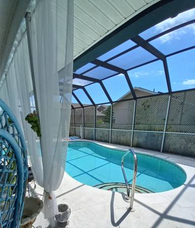 SWIMMING POOL/LANAI AREA...Lanai has electric fireplace, THEPOOLBAR (a swim-up inpool bar), dining area, currently set up with seating area for 12, so plenty of room for all your friends. The recent addition of SUPER GUTTERS has stopped the pool and lanai from flooding, a problem many pool home owners struggle with.