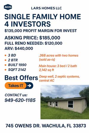 745 Owens Dr, Wauchula, FL 33873 Spacious 3 Bed / 2 Bath home with over 2,100 sq ft on a large 3.68-acre lot. Property also includes a second smaller home on-site. Built in 1990 Deep well & 2...
