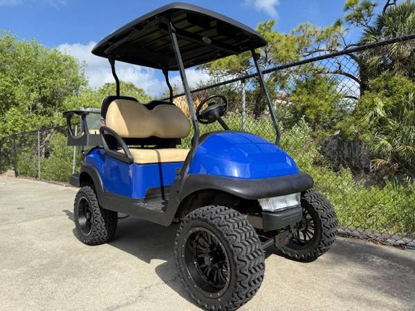 2017 Club Car Precedent, 48 volt electric with NEW 8 volt batteries, New folding rear aluminum seat, NEW lights and wiring, New blue body, NEW heavy duty six inch lift kit, NEW 23 inch all terrain tires with NEW 14 inch aluminum rims, and battery gauge - great condition.