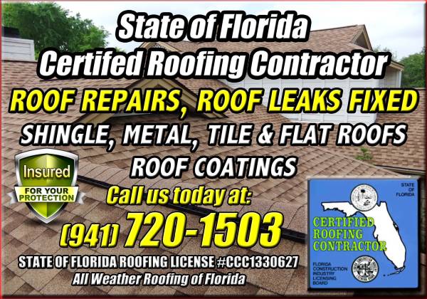 ROOF REPAIRS, BY LICENSED ROOFER. Shingle Roofs. Tile Roofs, Metal Roofs and Flat Roofs. ROOF LEAKS FIXED. Roof Coatings. Roof ridge vents, valley flashing, repairs, roof vent repairs. Cracked roof tiles. Flat roof seams sealed. Roof leaks repaired. Roof repair specialists. Tile, metal, shingle and flat roofs. State licensed and fully insured roofer. Roof coatings for tile roofs, flat roofs and mobile home roofs. Experienced Roofer. licensed roofer, City of Sarasota licensed roofer. Roof Permits on all new roofs as required by law with decking nailing mitigation of roof decking at 4 inches and six inches. Secondary water barriers. New drip edge. Roofing License Registered with building departments and Certified with the State of Florida. Manatee roofer, Quality Workmanship and Materials, Reasonable Rates. Be prepared for the storm and hurricanes. Licensed State Roofing Contractor. Roof repairs. Roofing company licensed and insured, roof repair, roof installation, roof leak repairs. Roof protection. Roof inspections. Repairs to leaking roof, roofing contractor, aluminum, metal roofs, roof, roofer, roofing repairs, TPO roofing, flat roof, asphalt shingle roofs, roof membrane, roof leaks, roll roofing, flat roof, metal roof, residential roofs, commercial roofs, hot tar roofs, hot bitumen, gravel roofs, fully adhered roofs, hot mop roofs, roof leak specialists, coatings, silicone roofing, white, granulated roofing, emergency roof repair, and more. Roof repair, roof coatings, roof patch, roof patching coating, silicone, elastomeric, roof sealant, roof sealing, water-tight, roof waterproofing, shingle roofs, tile roofs, shingle roofs, flat roof, metal roof, fascia, plywood, rotted wood, roof paint. Roof color changes. Roof cleaning. Rainy season roof repair. Mobile home roofs.