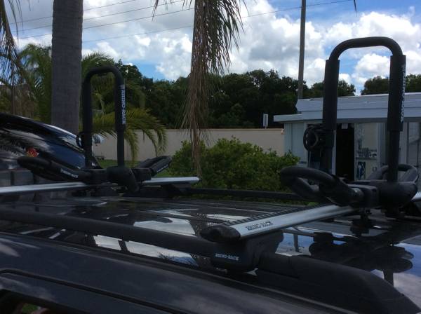 Rhino-Rack - Qty.2 - J Style Folding Carriers for side loading 2 Kayaks. Rhino Cross Bars - Qty. 2 - 4'. Rhino-Rack SX Legs for Vortex Bars - (for) raised Rails - Qty 4 - (*use if you have a roof rack). Clamp-on Legs X4 (*use if you do not have a roof rack). 8 very long sawtooth straps. Also paddles and life vests. Was used on a 2018 Dodge Journey. Excellent Condition! Sold as a complete set only (kayaks and roof carrier rack). Decals shown are removable vinyl........ Cash only.