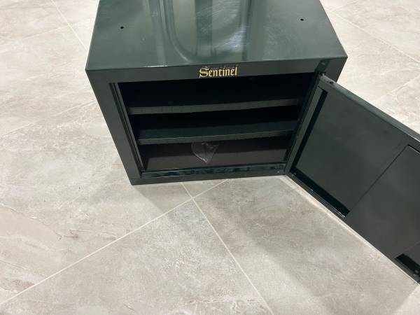Like new gun cabinet with key. Can hang on wall or place on floor. Sturdy, green color. 21”Lx18”Hx10”D