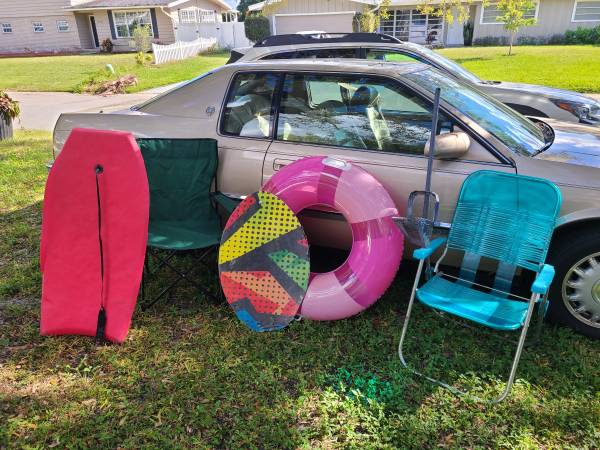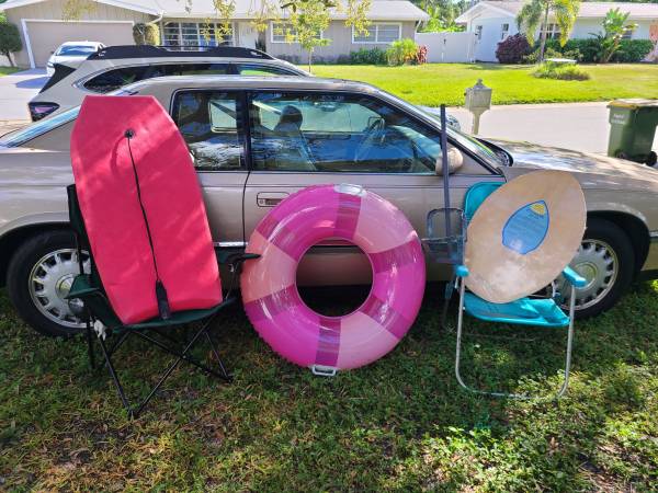 Cheap fun 2 beach or pool chairs, both folding style (green one is new) 1 boogie board - 42" - good for kids, teens or adults - well used but it'll provide many more rides - plenty of volume to...