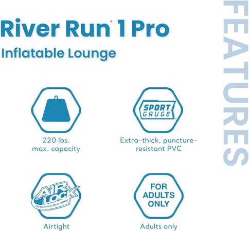 River Run 1 Pro Inflatable Floating Lounge: GoPro/Phone Mount – Built-in Cup Holder and Storage Compartment – Durable Grab Handles – Easy-to-Use Connectors NEW IN BOX $60 EACH