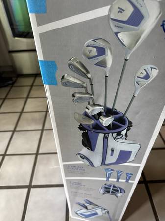 Brand new 13 piece top light women’s golf set. Includes a composite driver, fairway wood, hybrid, 5-W irons, alignment, putter, 3 headcovers, and stand bag.