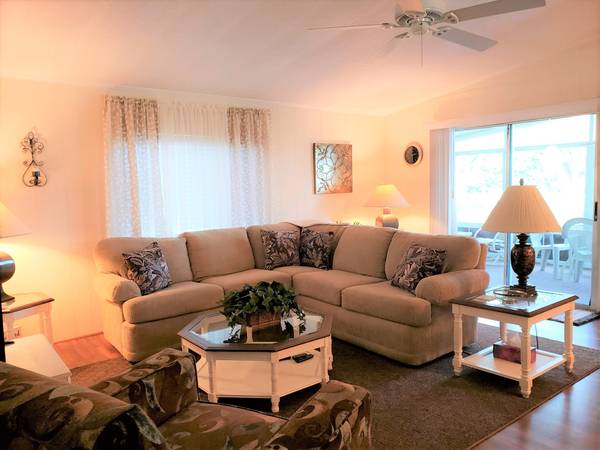 It is a 1000 sq. ft. home with a carport, laundry room in carport shed, 12' x 22' screened/enclosed lanai for year-round use. Vaulted ceilings in LR, dining room and kitchen. Master bedroom has a king bed, private bath and a walk-in closet. Guest room is an office/sitting room not a bedroom. It is on a shaded corner lot, with a lake view and a short walk to the club house and facilities. This is a 2-person maximum rental. All occupants must be 55+.