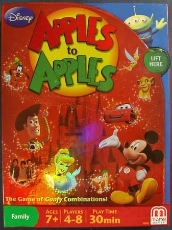 Pic 3) Disney Apples to Apples card game. 2012 edition, seems complete, as new condition. Ages 7+, 4-8 players, 30 minutes play time. Look it up online for more details. I think this version is out of production, so if you love Disney and card games for or with your kids, here you go, for less than they get on e**y with added shipping...$10