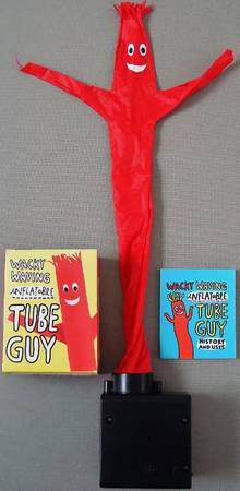Pic 6) Wacky Waving Inflatable Tube Guy, mini-size. By Running Press, 2018, 17" tall, for table tops. Works pretty good, box has 1 taped tear on back. Takes a 9V battery, which is NOT included. Complete with a story book about Tube Guy too, and instructions. $12.95 on the box, and people are paying over that on e**y frequently, as this seems out of production. Yours for...$10