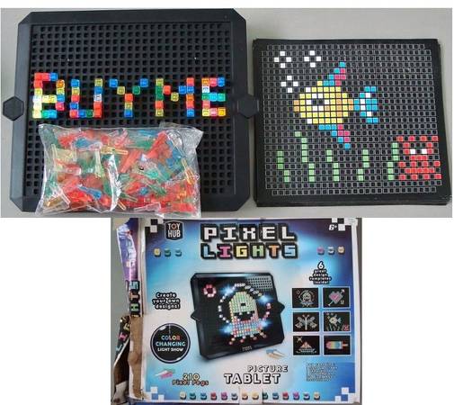 Pic 4) Pixel Lights by Toy Hub. Multi colored pegs go in the 8"x9.5" tablet and they light up when it's turned on (they're on in the pic's subtle message). 210 pegs, 6 templates to try, and 2 blanks to figure out your own designs, or you can free hand whatever you want. Box is trashed, got wet, but panel was protected by the plastic bag. Takes 3 AA batteries, which I included. Instructions also got wet and stuck to the bag so they're torn up a good bit, but you can figure it out, it's not rocket science. Pressing the power button several times gives you choices of solid light, or 3 levels of blinking lights, and I think it goes off after 15 minutes to save batteries. Says for ages 6+, but many reviews had as young as 2 years old loving it and learning. Just...$5