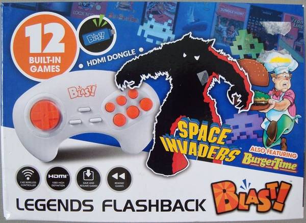Pic 2) Legends Flashback BLAST! video game and controller. By ATGames, model WD3304, from 2017 I believe, and out of production, but widely available for well under the $29.99 retail price. NAMCO makes the same thing. 12 classic games built in and a 2.4G wireless game controller, video output is 1080i resolution. Controller requires 2 AAA batteries (not included). Features Space Invaders, based on the Atari 2600 version, and other Atari and other games, you can see the list at https://blast.atgames.net/blast_family/4/game_list. Complete, but instructions are printed from an online image, as the original was lost, so a bit harder to read. It works fine, dongle plugs into an HDMI port in your tv or computer with a short USB cable, so you may need an extension. Plugged in to my Xfinity X1 box fine, dongle in the TV HDMI port, and it played fine on a 40" screen. Controller may be a tad slower than you're used to, but that's retro too. And if you're old enough to remember these games, you won't have a problem with the graphics, that's how they looked back then, so pay no attention to the young-ins online who complain about the poor graphics. Box is a bit warped with some layer separation on one end, nothing inside affected. Go retro and show your kids how you did it in the good old days for...$10