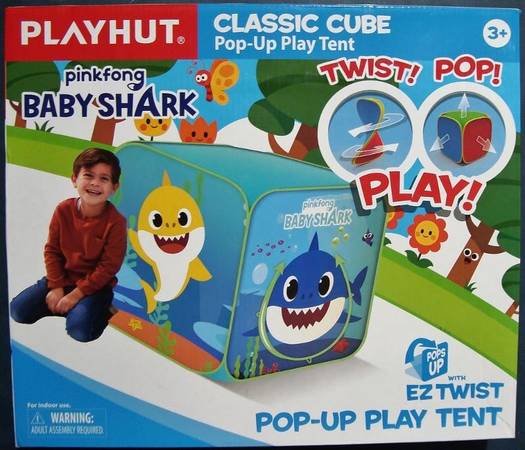 Pic 5) Playhut Classic Cube Baby Shark pop-up play tent. Never used near as I can tell, tent is still in bag inside. Twist and Pops open to 26x26x26", so pretty small, and no, it doesn't play that song. This version doesn't appear to have the 2 extension tunnels that show on another later version. Ages 3+. Box is in very nice condition too. I think these were about $30 new, yours for...$10