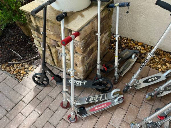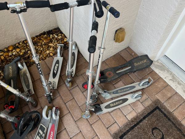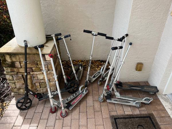 10 Scooters different sizes, some in better shape than others, all usable, all fold for storage. $30 for all of ‘em.