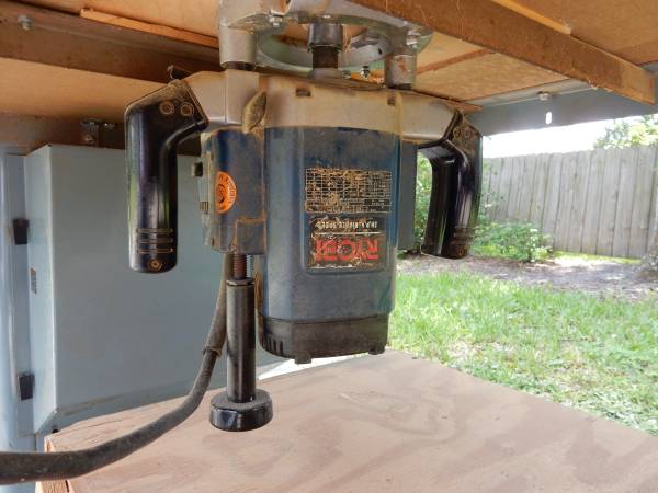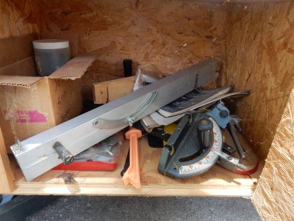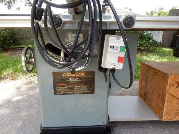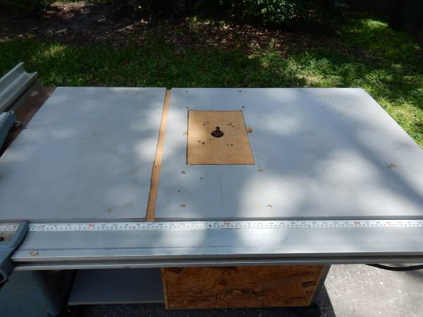 Delta table saw that has a built-in router. There is also a toolbox on the bottom with a variety of items. The power switch and power cord were recently replaced. In good condition.
