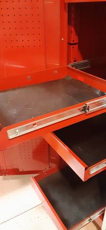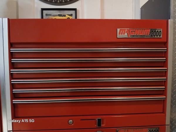 This is a heavy-duty industrial grade 3 piece roll tool chest Magnum by Waterloo. Each cabinet has separate locks for added security. All drawers have ball bearing roller glides for heavy items. Base cabinet is 36 x 36 x 21 with 8 drawers 2’’ to 8’’ high, wheels are 6’’ dia. with grease fittings & wheel-locks. Top cabinet is 24 x 36 x 21 the top lifts open with 2 gas struts, 5 drawers 2” to 4” high. Side cabinet is 60 x 19 x21 with 4 adjustable drawers. Total dimension is 66 x 55 x 21.