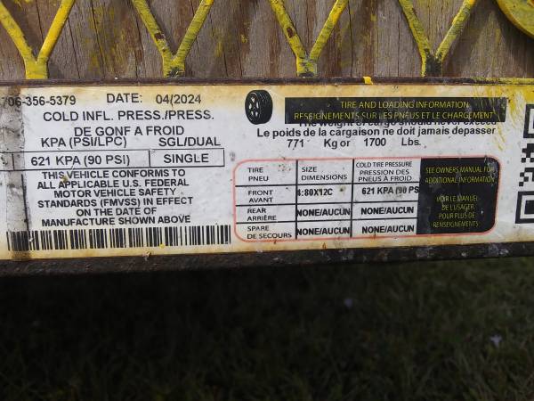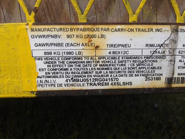 This 2024 Carry-on Trailer was manufactured in 2024 Bed is 4 foot wide by 5 foot long. GVWR - 2000 LB Only used occasionally. Wooden cap can be easily removed (Owner add on) Purchased new for $980 +...