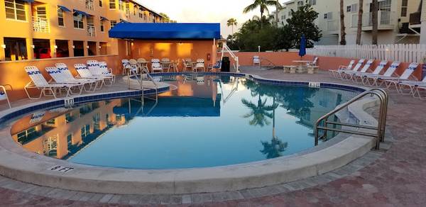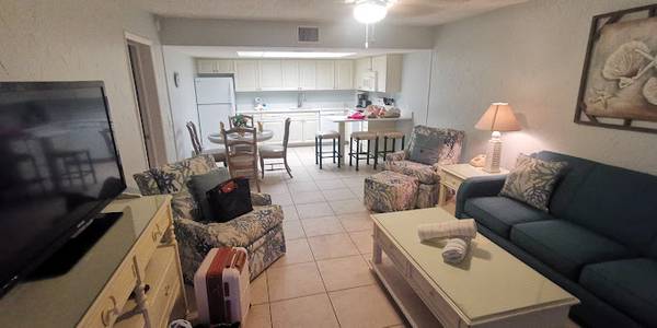 Smugglers cove is in a excellent location, From the living room sliding door your view will be a park like setting with view of Bay and on the front of resort you will cross the street to sugar like beach with miles to walk. Our condo is a 1 bedroom with full kitchen. there is a trolley that you can get on at the front of the resort that goes thru out island